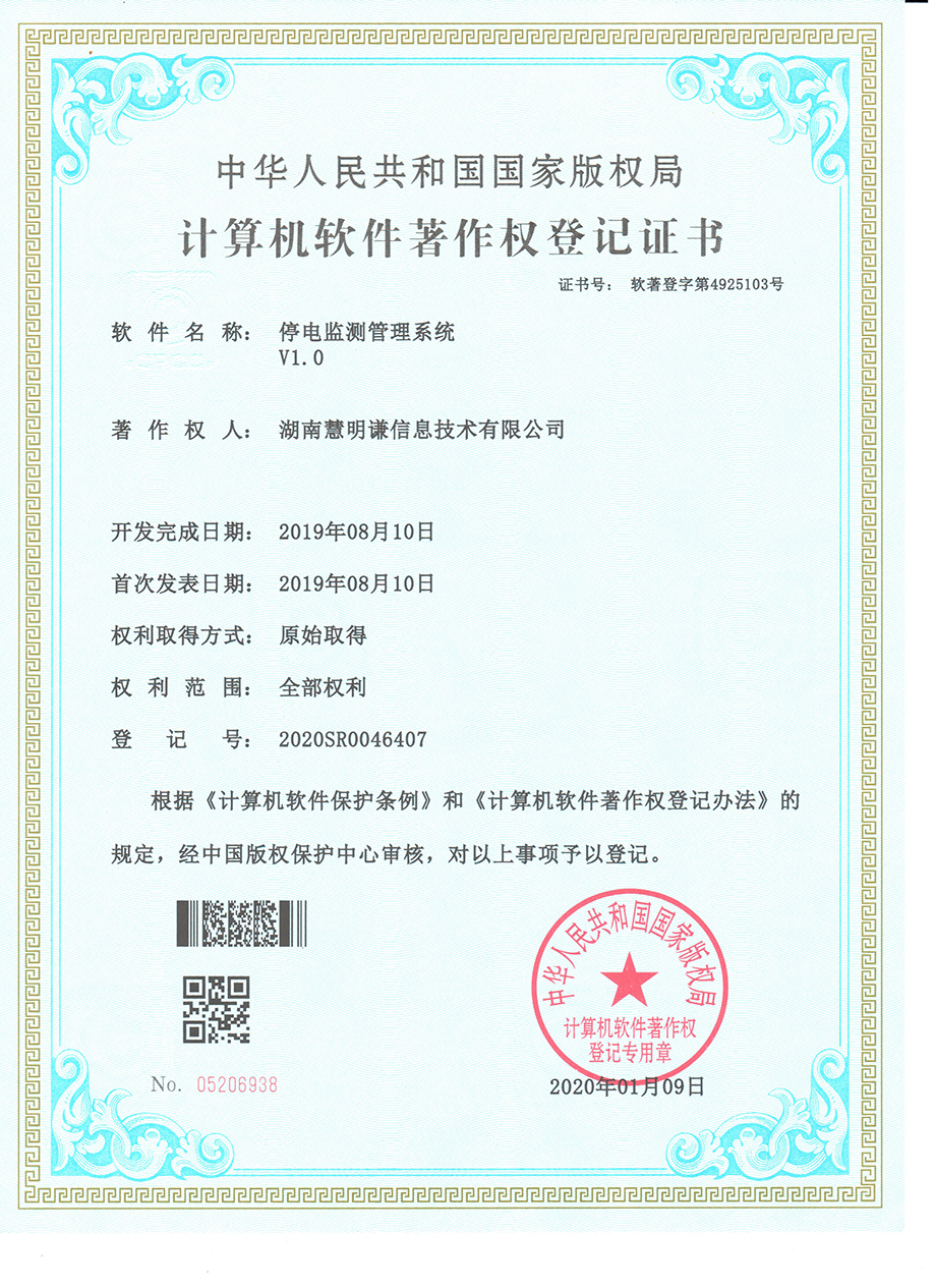 停電監(jiān)測管理系統(tǒng)V1.0著作權登記證書