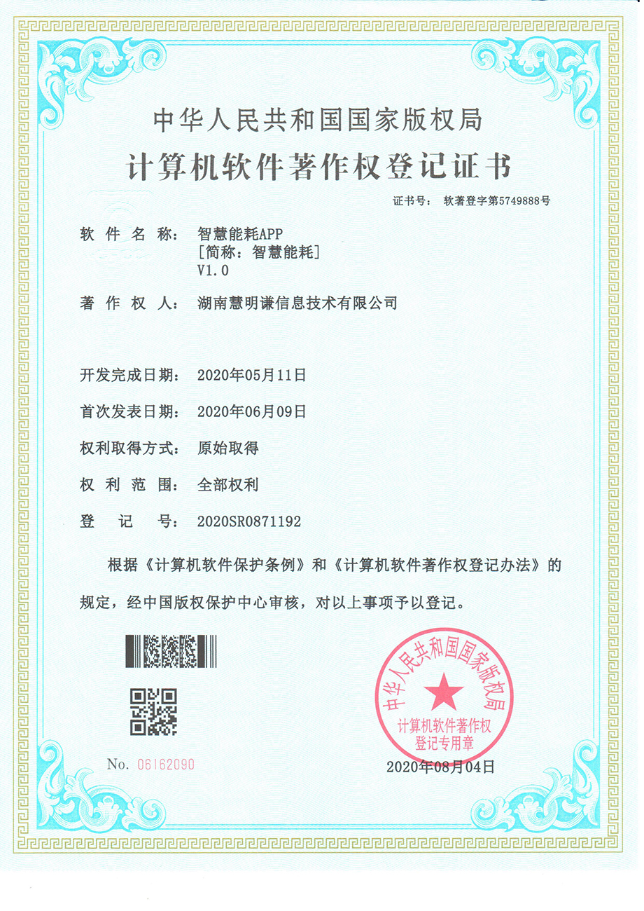 智慧能耗APPV1.0著作權登記證書