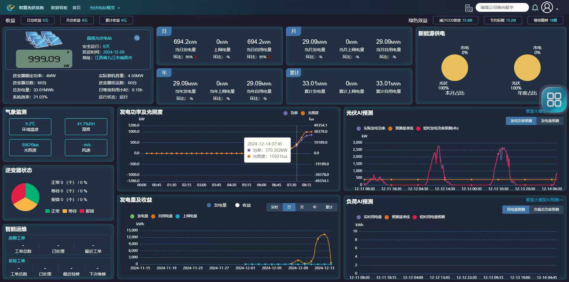 項目概況:位于濂溪產(chǎn)業(yè)園的九江晶旭新能源有限公司,是一家集太陽能技術(shù)研發(fā)、太陽能組件生產(chǎn)、太陽能市場化應用、太陽能解決方案為一體的科技智造企業(yè)。通過慧明謙智慧光伏系統(tǒng)具備發(fā)電統(tǒng)計分析(發(fā)電量、功率、效率、收益等)、智能監(jiān)控(溫濕度、光照度、風速等)、發(fā)電AI預測(短時、長時)、智能告警等功能實現(xiàn)智能化運維管理。