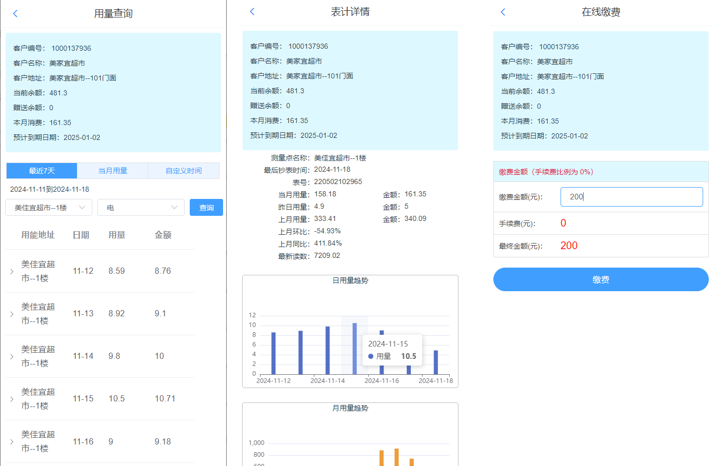 用戶可以在手機(jī)端查詢每天、每月的用電情況,可以通過(guò)手機(jī)隨時(shí)繳納電費(fèi),讓用戶用電清晰明了,降低管理人員的工作量,提高用戶體驗(yàn)感。