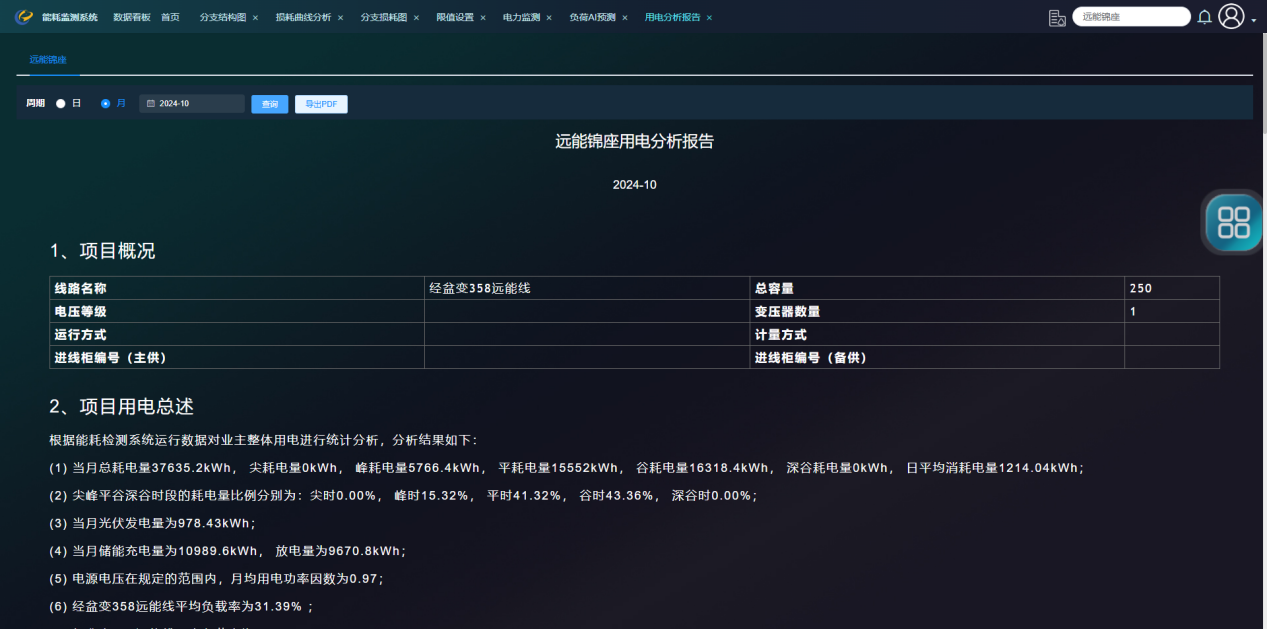 7) 以變壓器為單位,按日,按月自動(dòng)生成用能分析報(bào)告,包括供電量、售電量、變壓器運(yùn)行工況及整改建議。