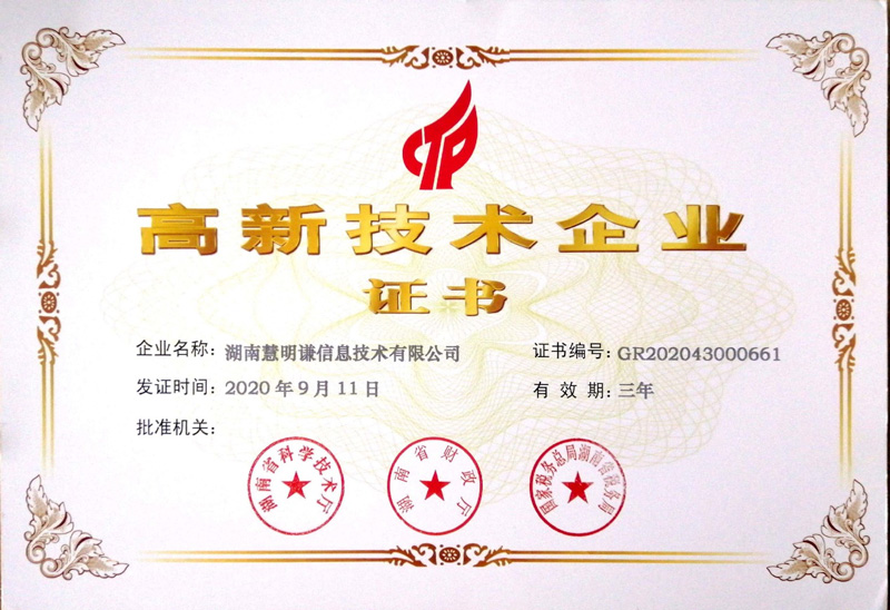 2020年是特別的一年,湖南慧明謙信息技術(shù)有限公司憑借專業(yè)的研發(fā)隊(duì)伍,雄厚的技術(shù)實(shí)力,持續(xù)的創(chuàng)新能力,科學(xué)的企業(yè)管理,被順利地認(rèn)定為國(guó)家高新技術(shù)企業(yè)。