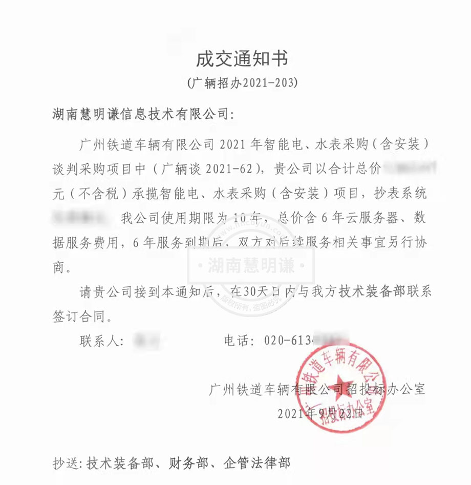 金秋九月,捷報(bào)頻傳,我公司憑借突出的業(yè)績(jī)、雄厚的技術(shù)實(shí)力以及良好的市場(chǎng)信譽(yù),在眾多競(jìng)爭(zhēng)對(duì)手中脫穎而出,中標(biāo)廣州鐵道車輛有限公司2021年智能電、水表采購(gòu)(含安裝)談判采購(gòu)項(xiàng)目中(廣輛談2021-62)承攬智能電、水表采購(gòu)(含安裝)項(xiàng)目,抄表系統(tǒng)等項(xiàng)目。