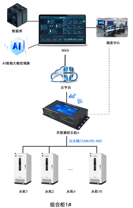 模式2:并聯(lián)集控主機(jī):EMS智能微電網(wǎng)控制器作為并聯(lián)集控主機(jī),EMS智能微電網(wǎng)控制選擇220VAC供電,可選內(nèi)置屏或者外接HDMI接口觸摸屏,作為并聯(lián)集控主機(jī),可安裝于并網(wǎng)柜或者單獨(dú)控制柜,最大支持10臺(tái)從機(jī),儲(chǔ)能容量可以根據(jù)具體應(yīng)用需求,從215kWh到2.15MWh靈活配置。