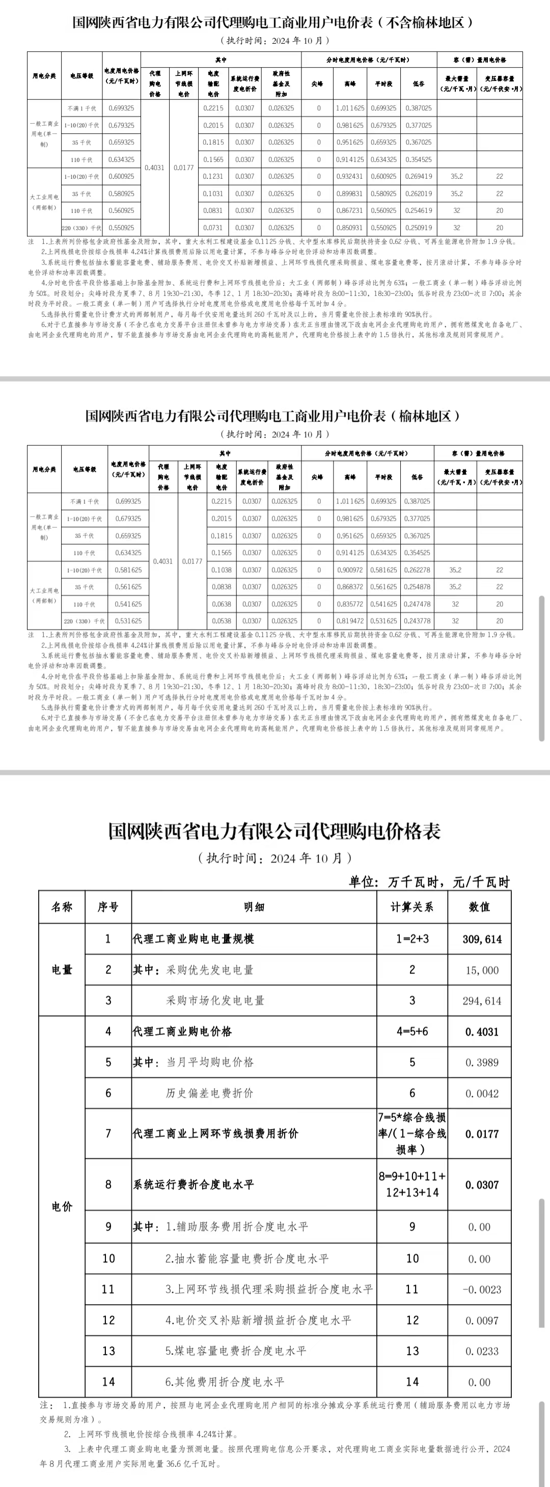 陜西省10月份代理購電工商業(yè)用戶電價表