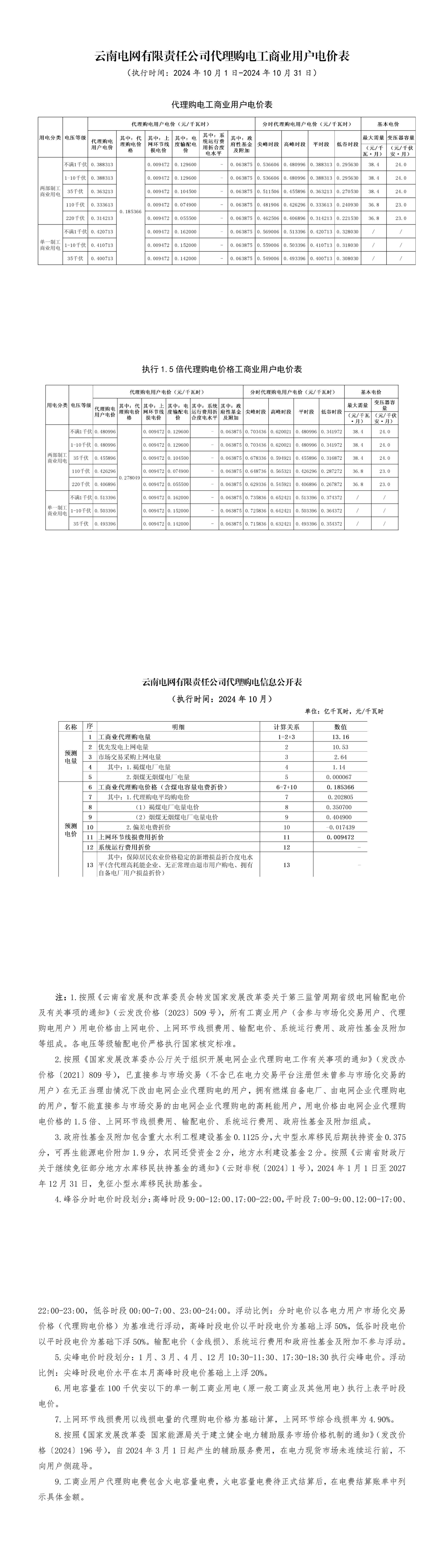 云南省10月份代理購(gòu)電工商業(yè)用戶電價(jià)表