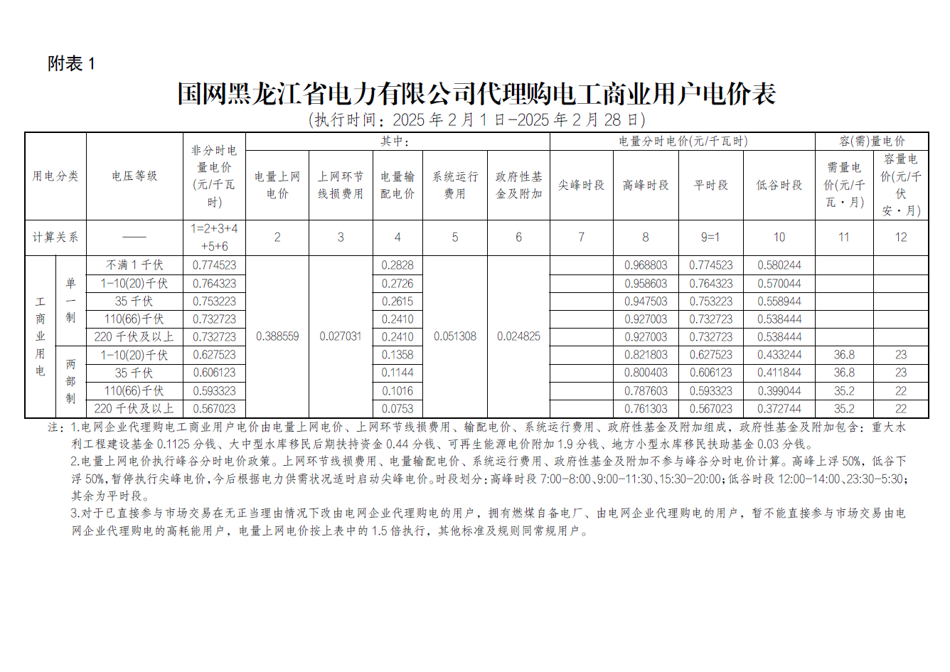 黑龍江省2月份代理購電工商業(yè)用戶電價(jià)表