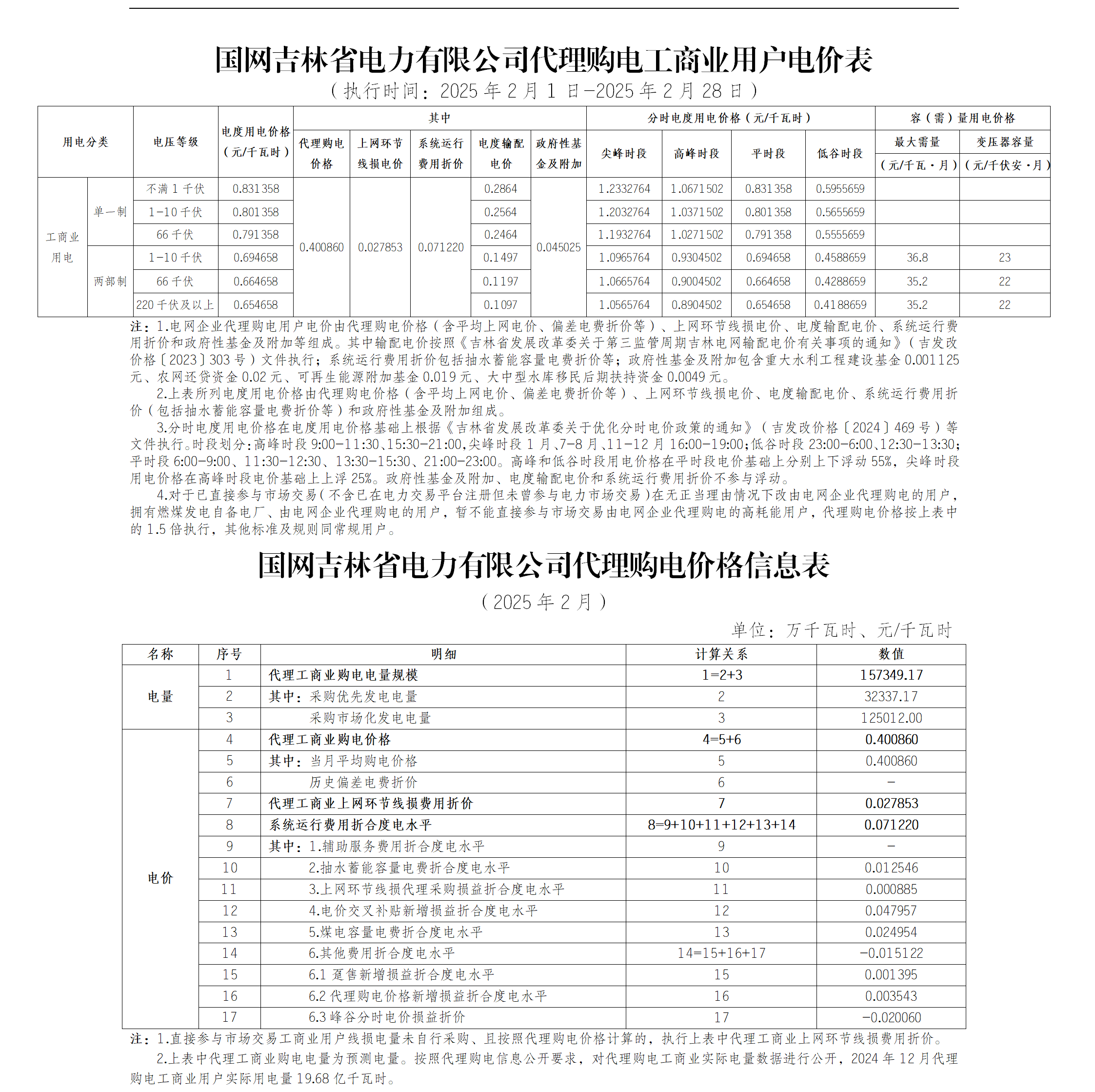 吉林省2月份代理購電工商業(yè)用戶電價(jià)表