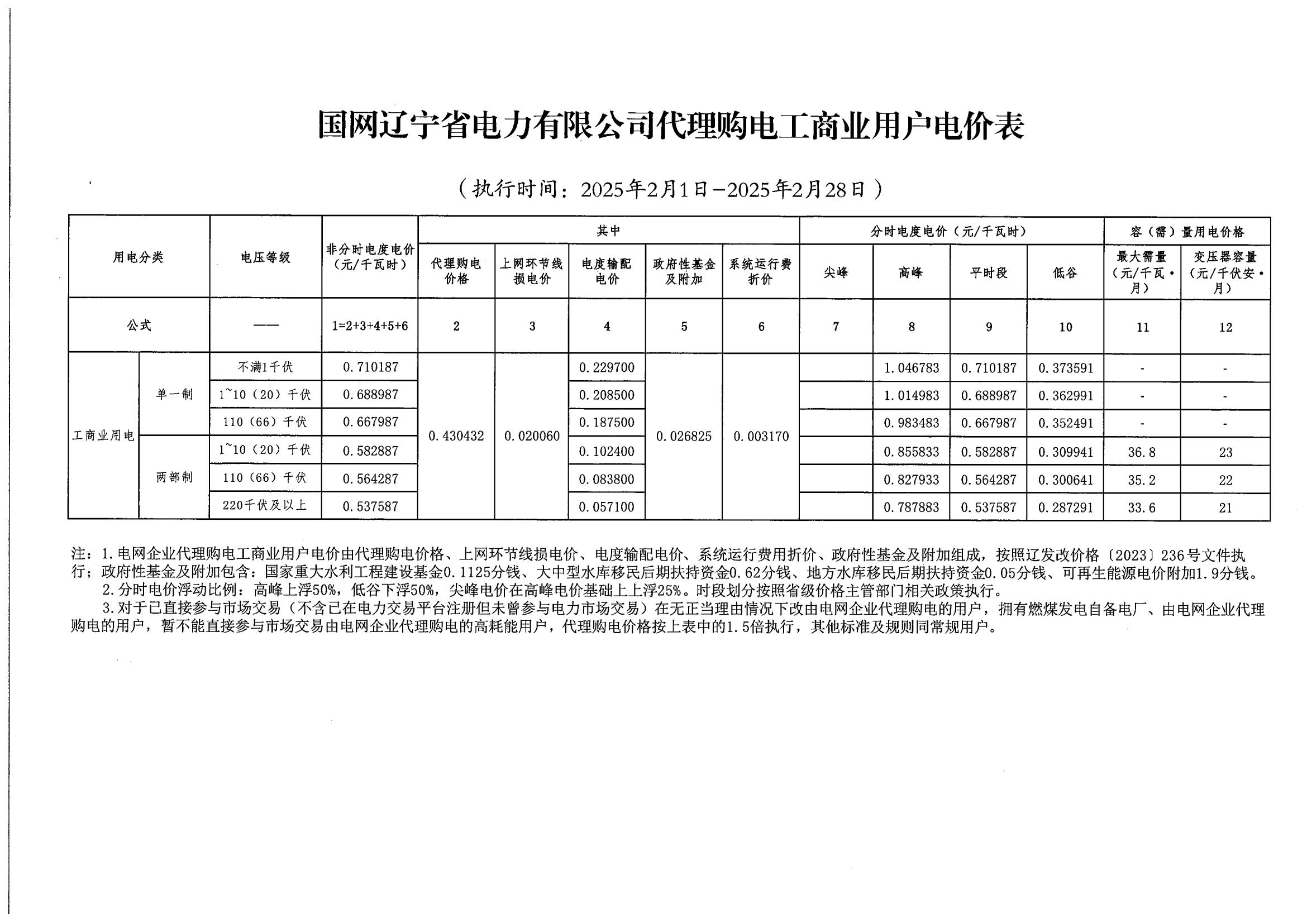 遼寧省2月份代理購電工商業(yè)用戶電價(jià)表