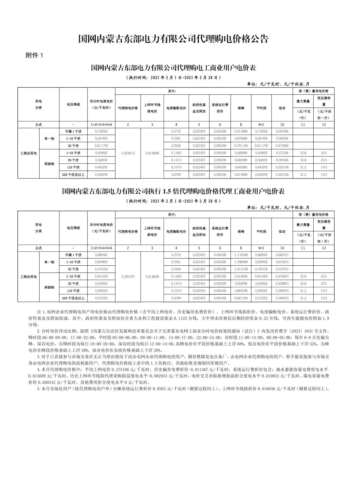 內(nèi)蒙古(蒙東)2月份代理購電工商業(yè)用戶電價(jià)表