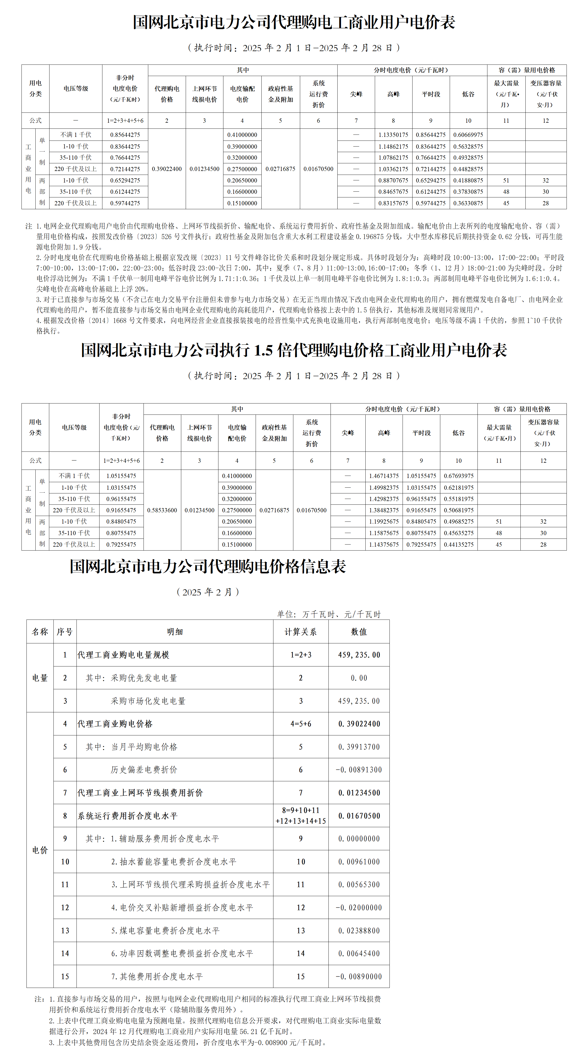 北京市2月份代理購電工商業(yè)用戶電價(jià)表