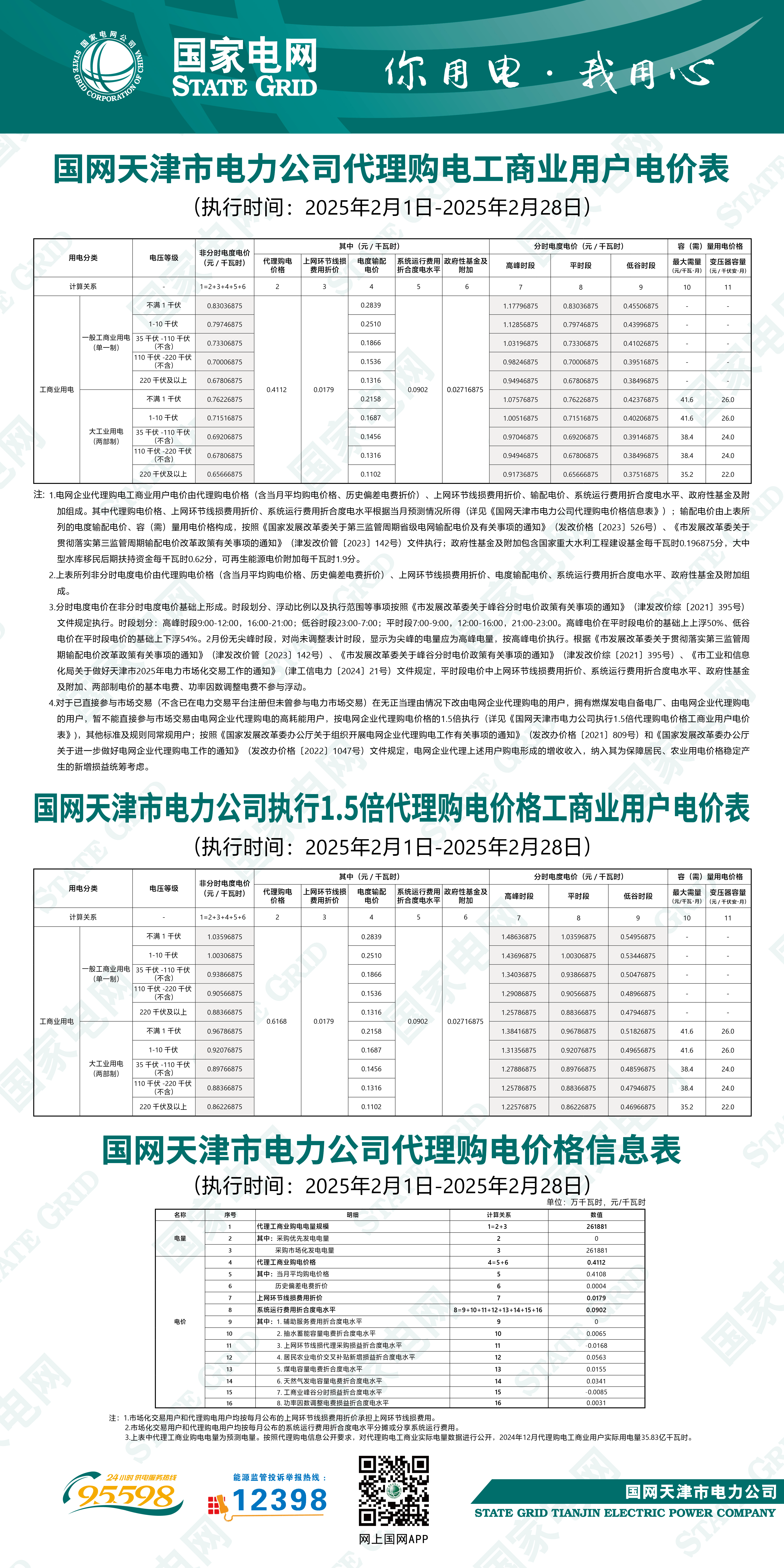 天津市2月份代理購電工商業(yè)用戶電價(jià)表