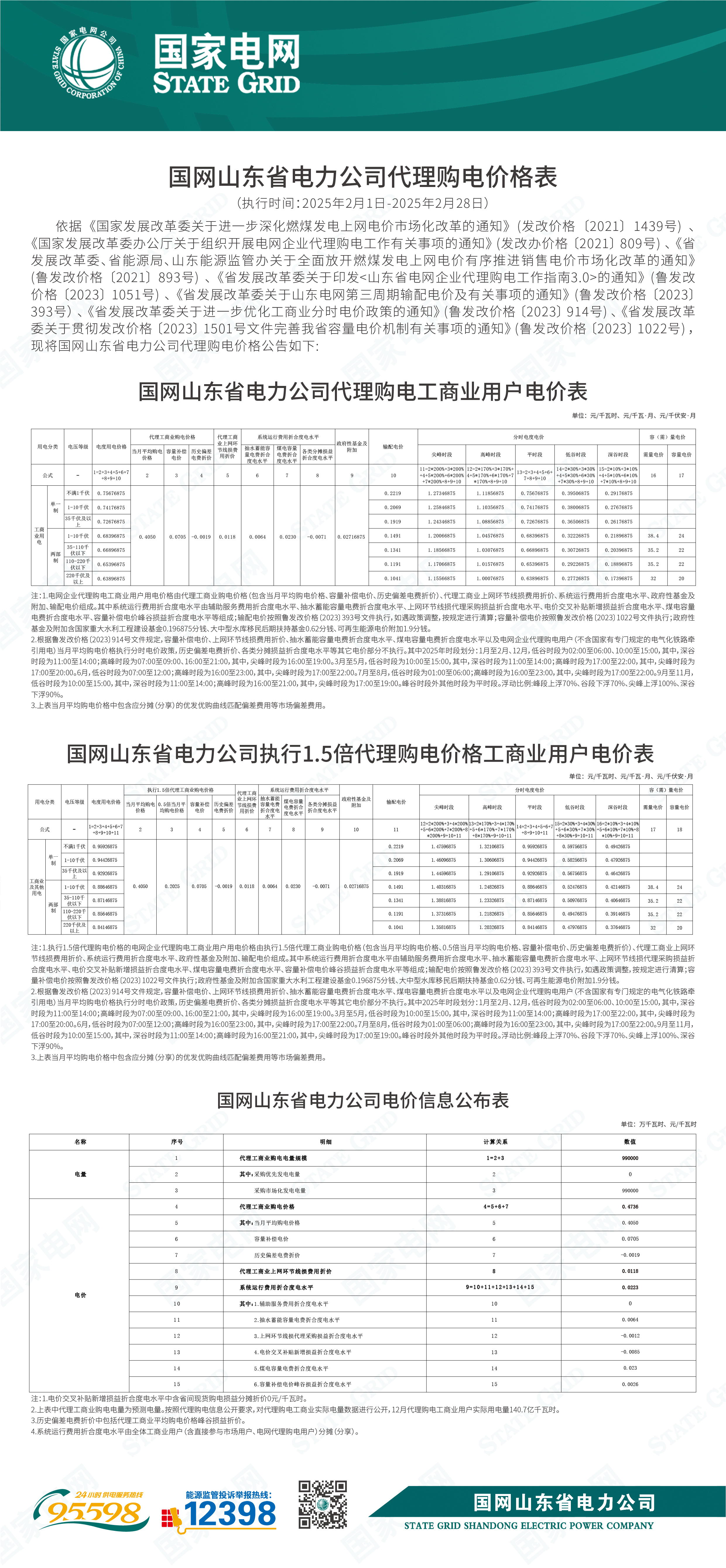 山東省2月份代理購電工商業(yè)用戶電價(jià)表