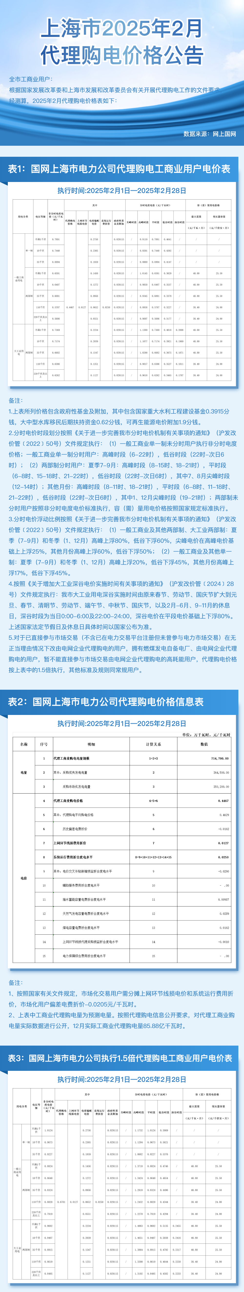 上海市2月份代理購電工商業(yè)用戶電價(jià)表