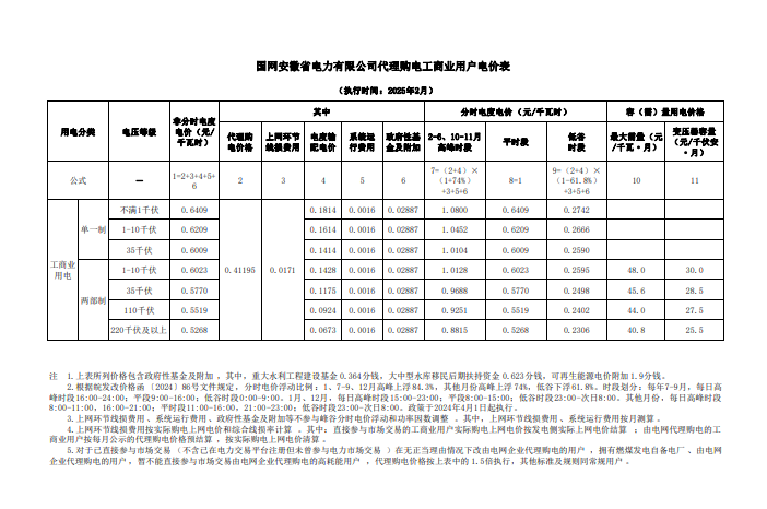 安徽省2月份代理購電工商業(yè)用戶電價(jià)表