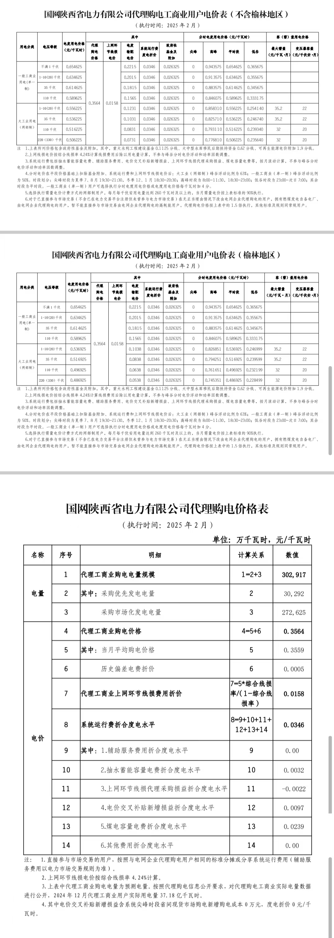 陜西省2月份代理購電工商業(yè)用戶電價(jià)表