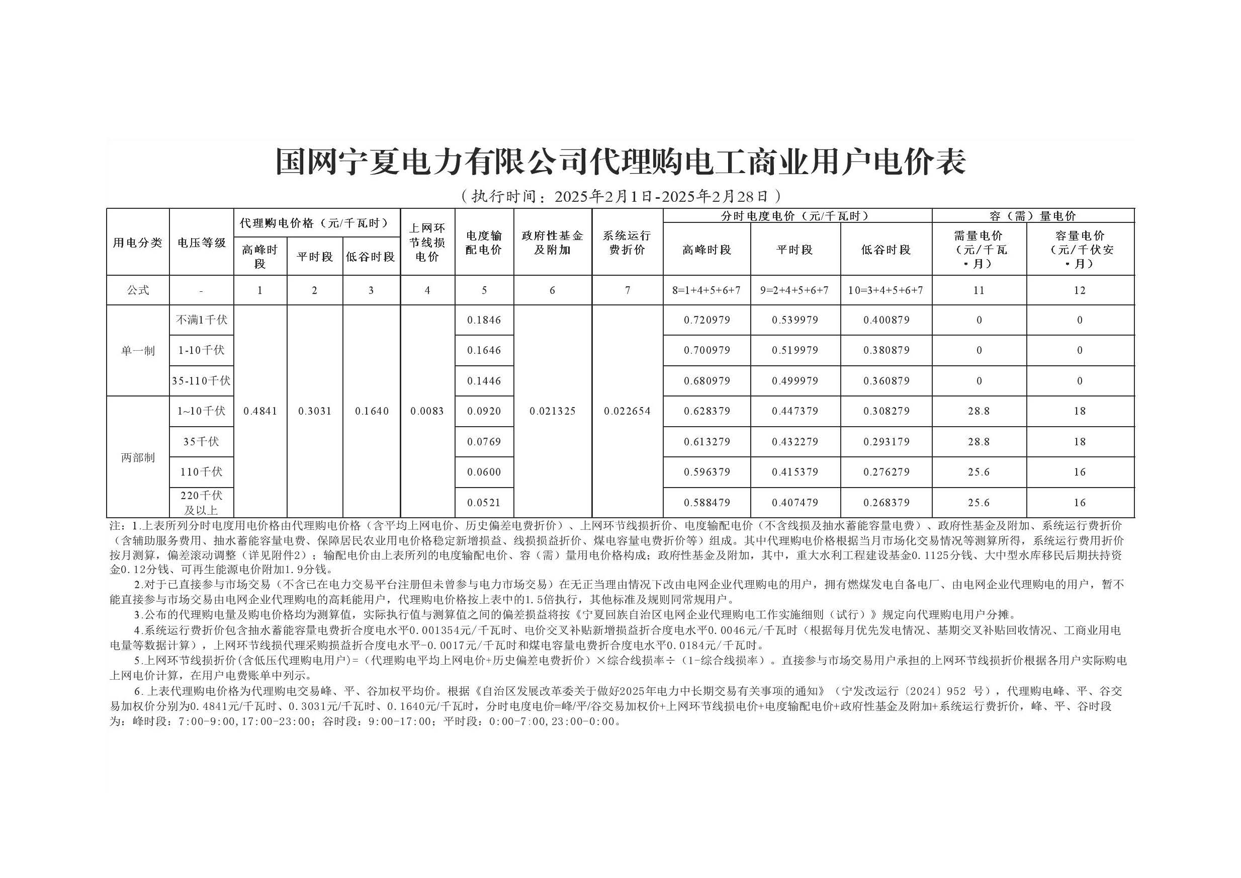 寧夏2月份代理購電工商業(yè)用戶電價(jià)表