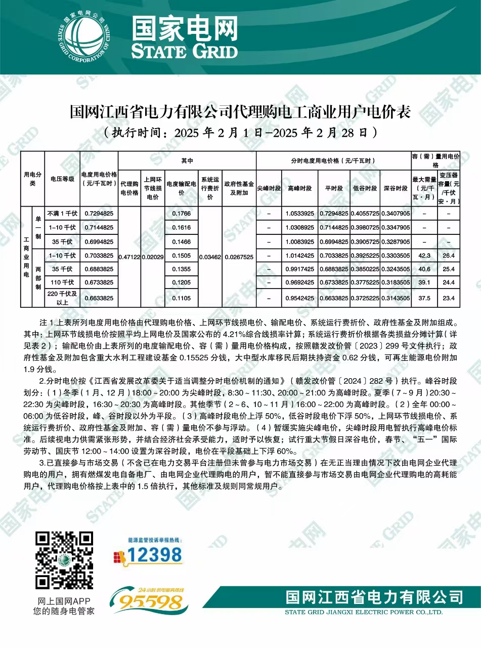 江西省2月份代理購電工商業(yè)用戶電價(jià)表