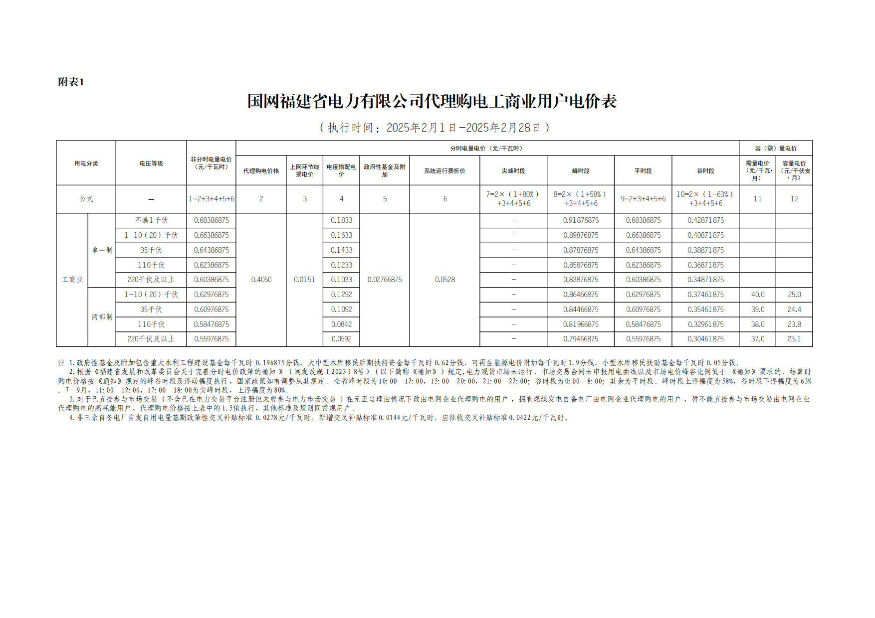 福建省2月份代理購電工商業(yè)用戶電價(jià)表