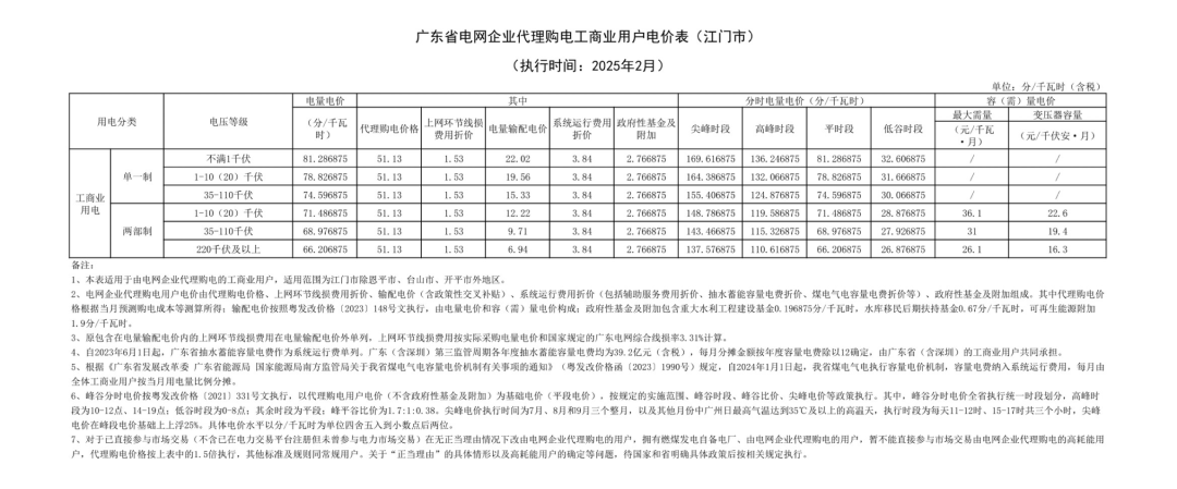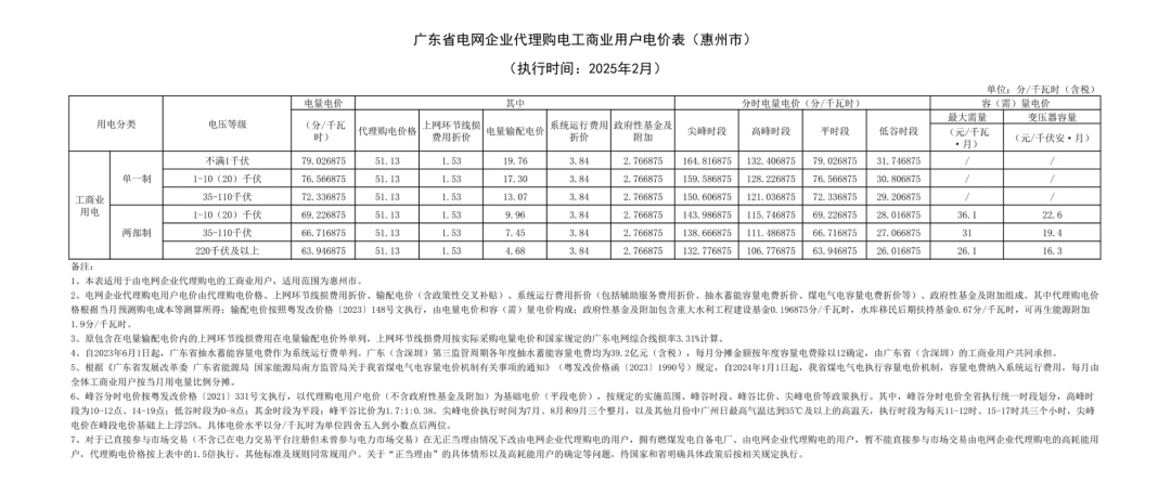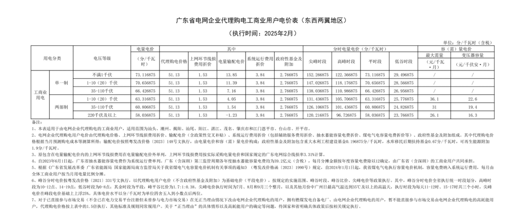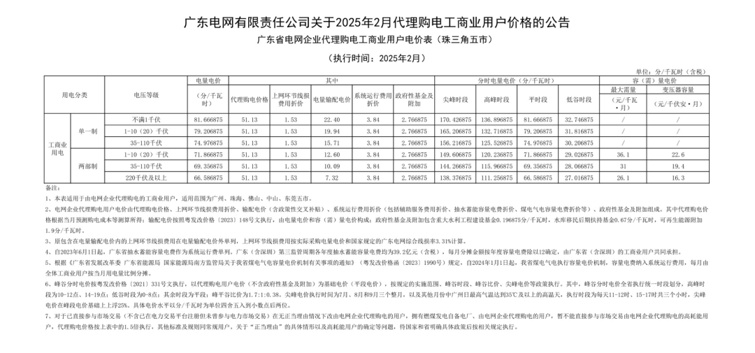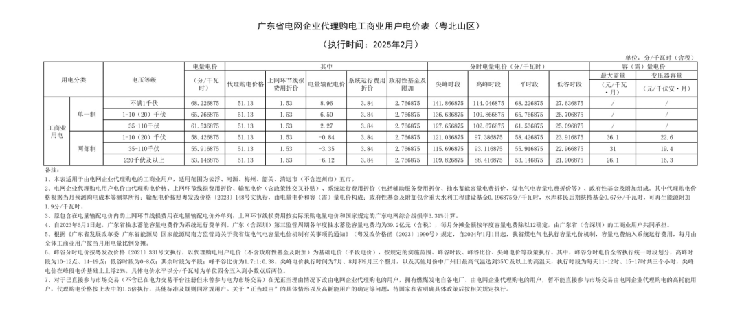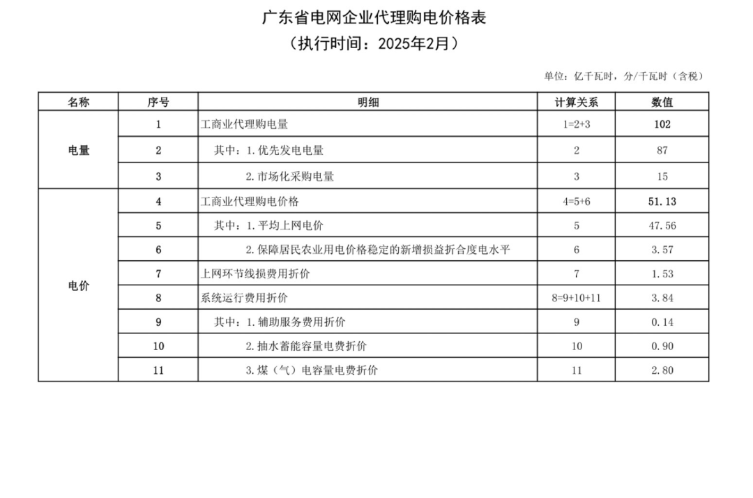 廣東省2月份代理購電工商業(yè)用戶電價(jià)表