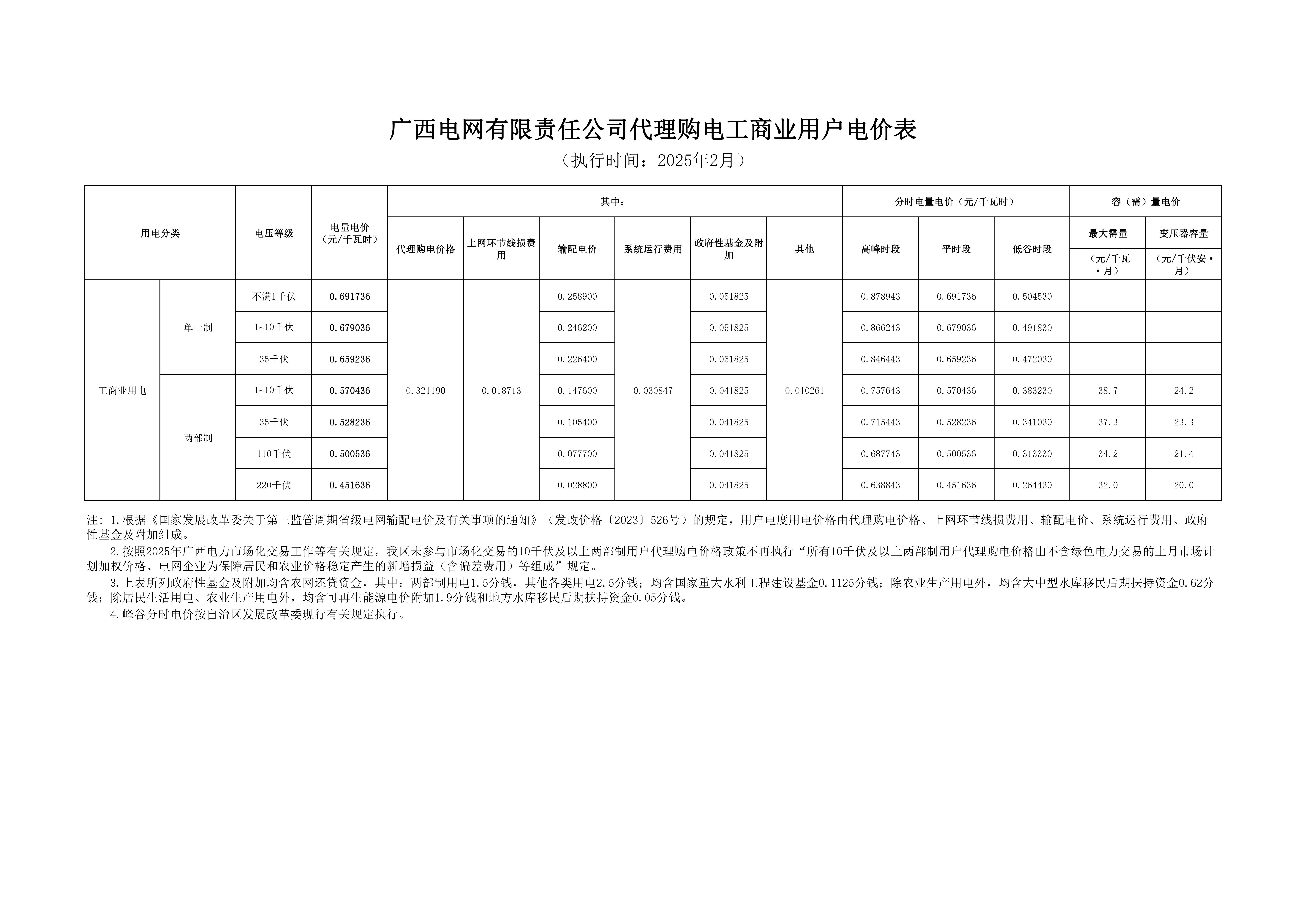 廣西省2月份代理購電工商業(yè)用戶電價(jià)表