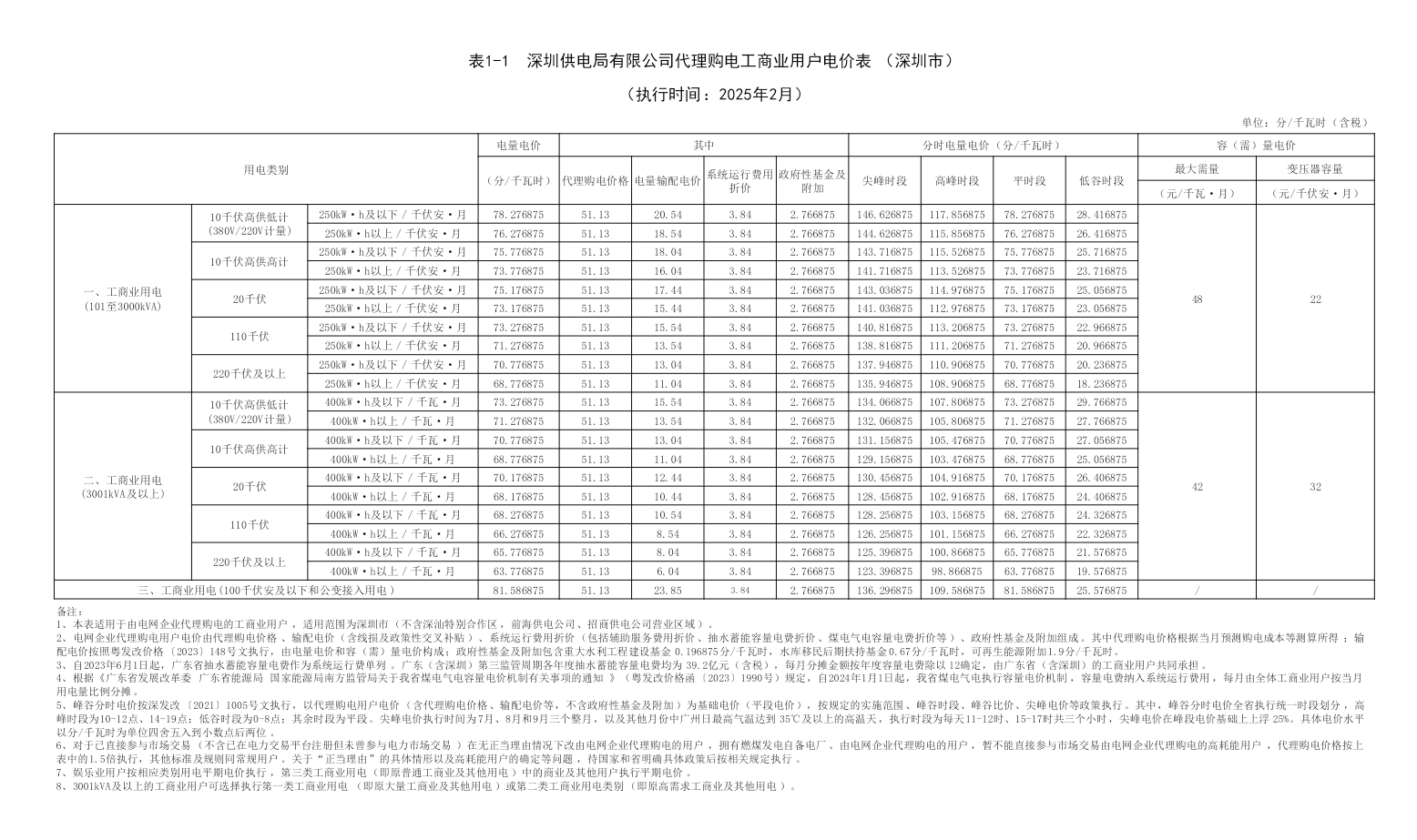 深圳市2月份代理購電工商業(yè)用戶電價(jià)表