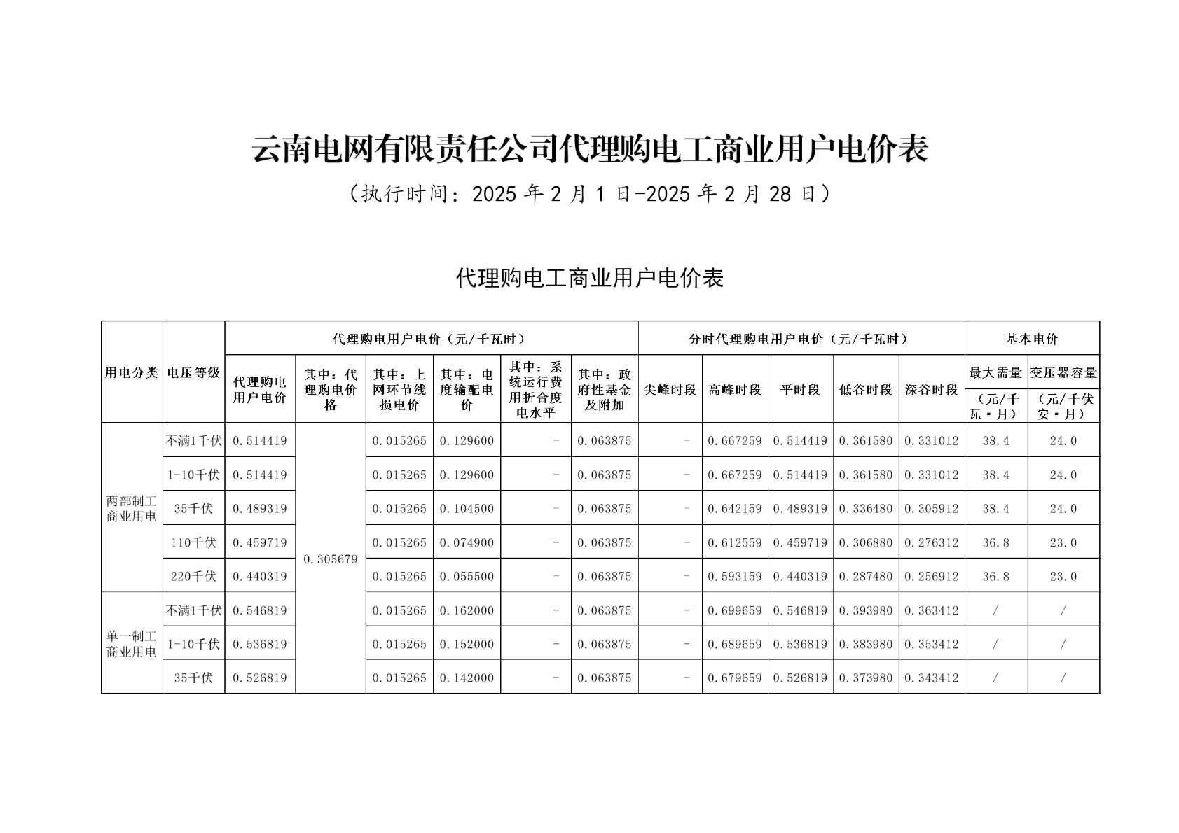 云南省2月份代理購電工商業(yè)用戶電價(jià)表