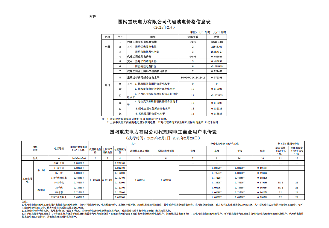 重慶市2月份代理購電工商業(yè)用戶電價(jià)表