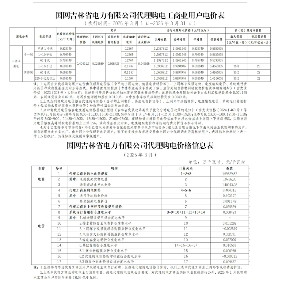 吉林省3月份代理購電工商業(yè)用戶電價表