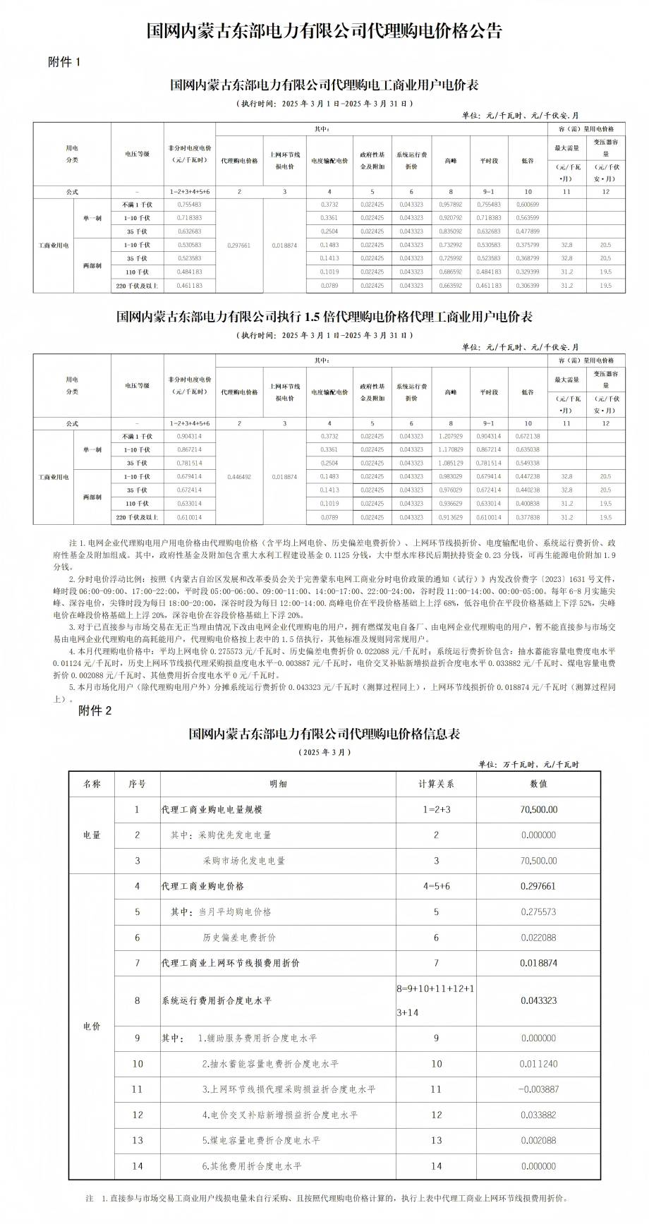 內蒙古(蒙東)3月份代理購電工商業(yè)用戶電價表