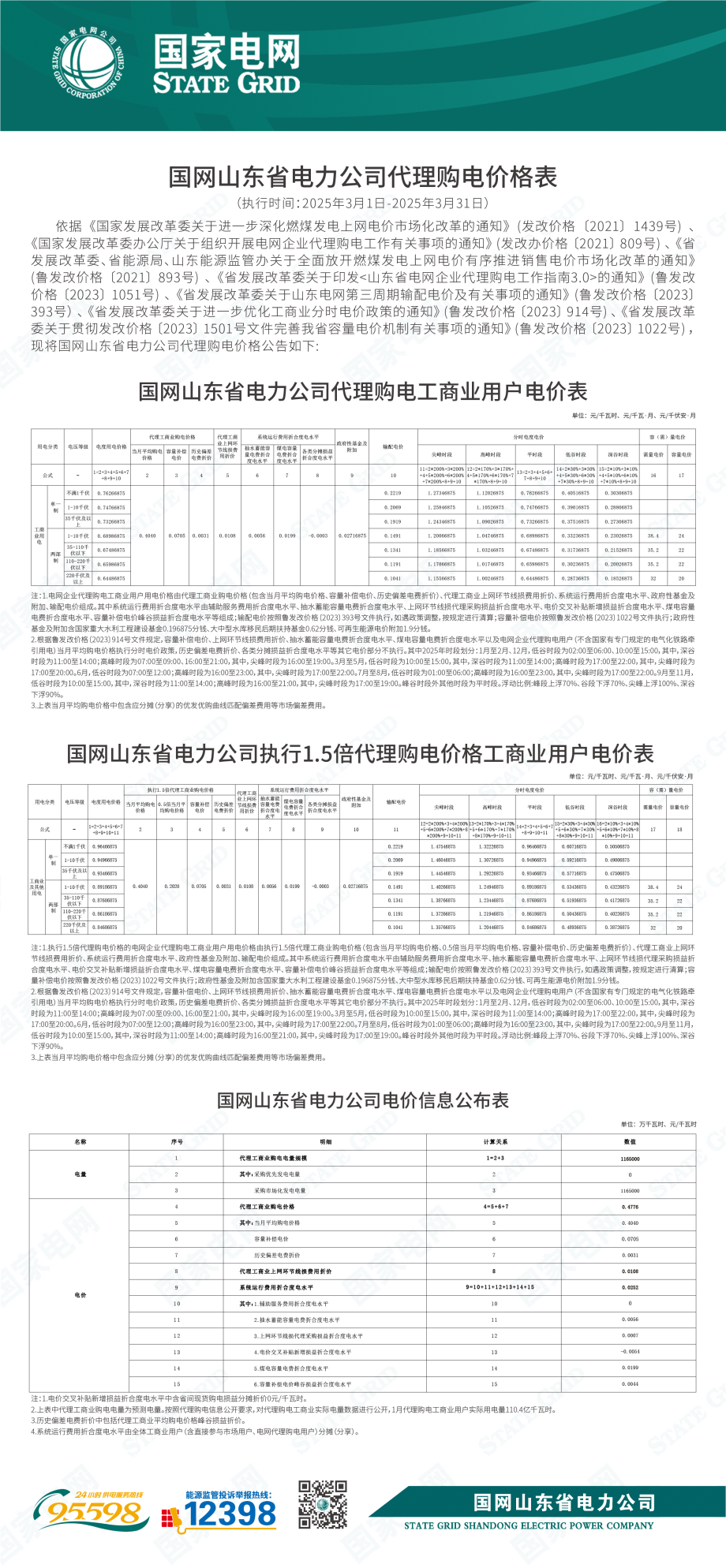 山東省3月份代理購電工商業(yè)用戶電價表