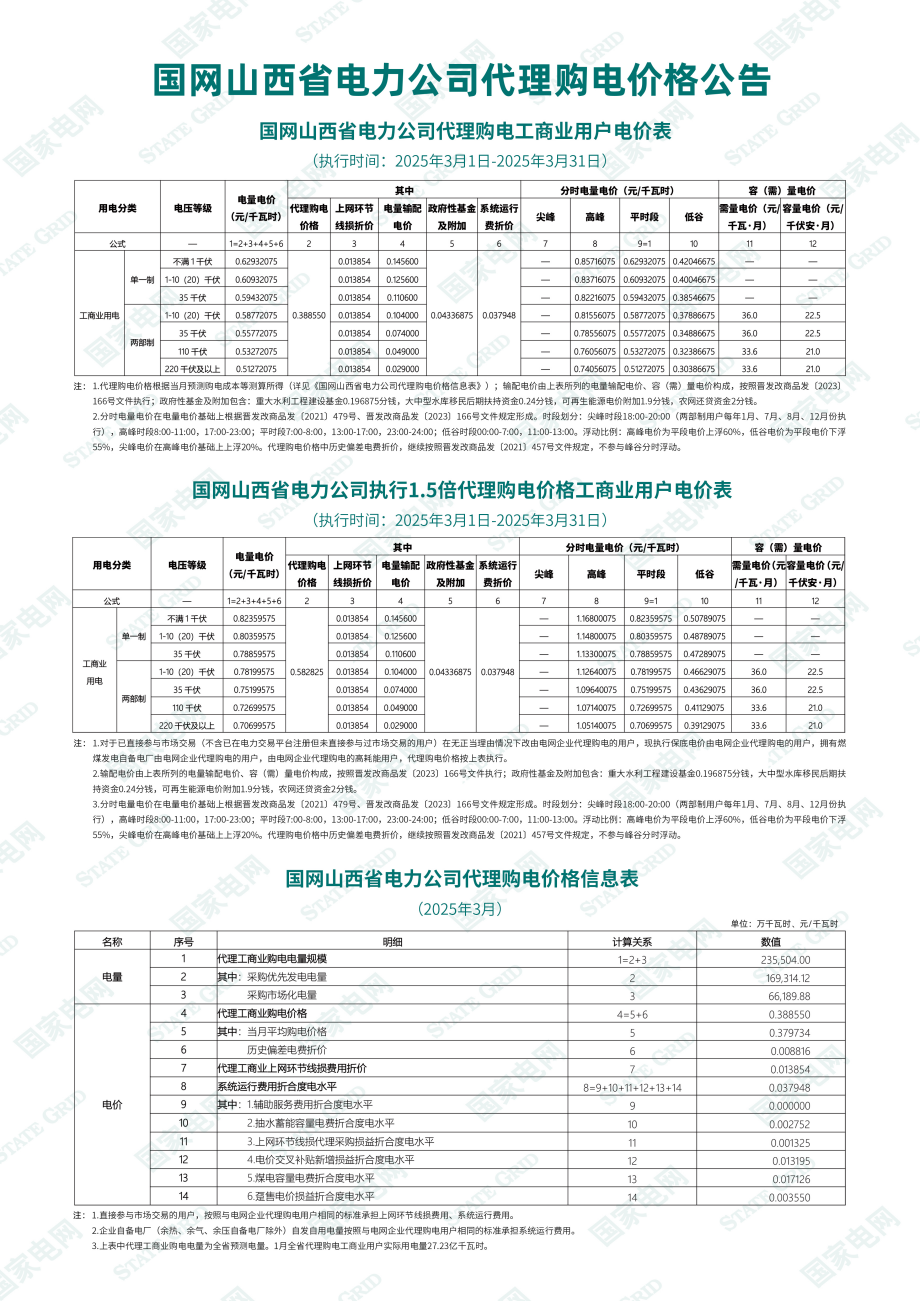 山西省3月份代理購電工商業(yè)用戶電價表