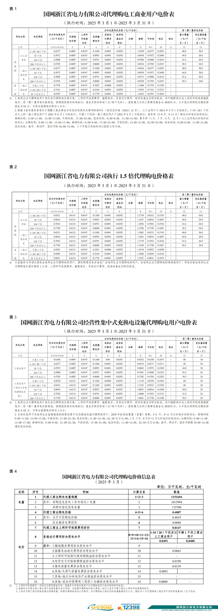 浙江省3月份代理購電工商業(yè)用戶電價表