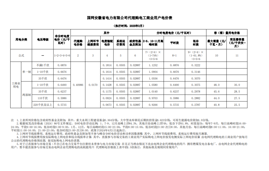 安徽省3月份代理購電工商業(yè)用戶電價表