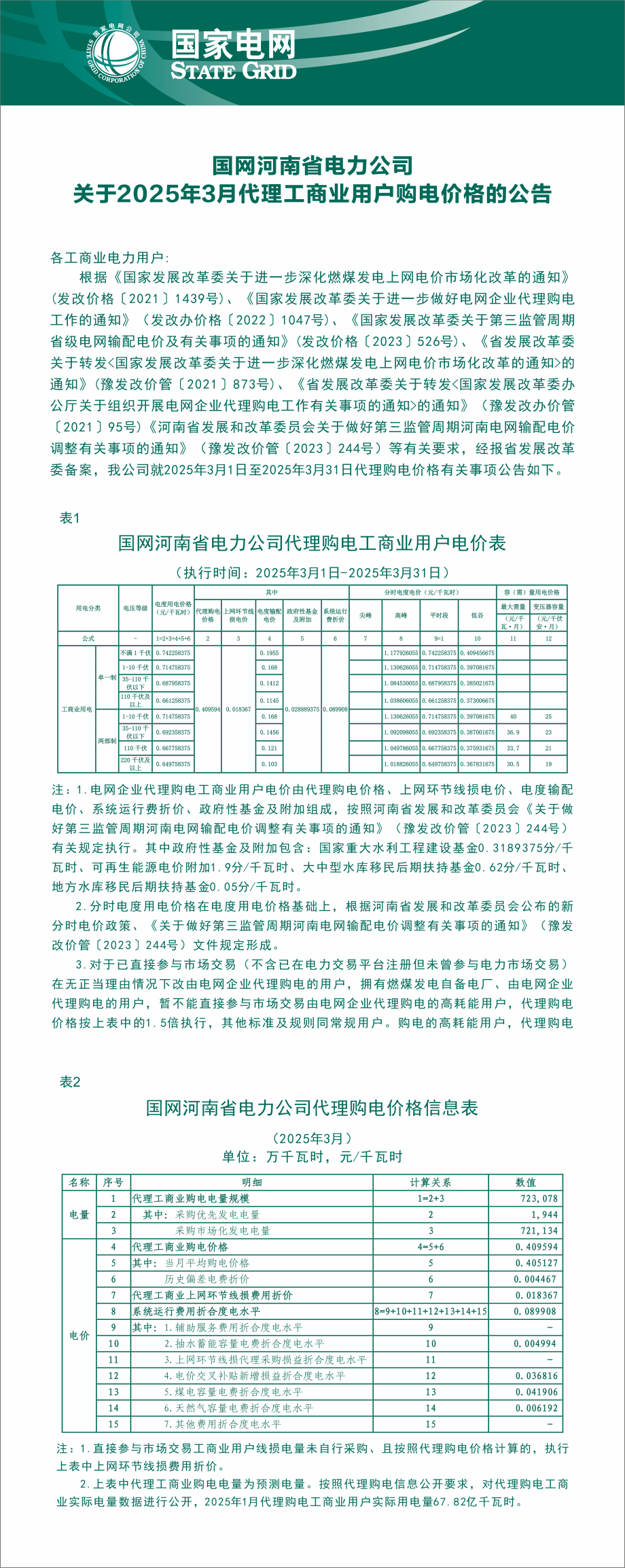 河南省3月份代理購電工商業(yè)用戶電價表