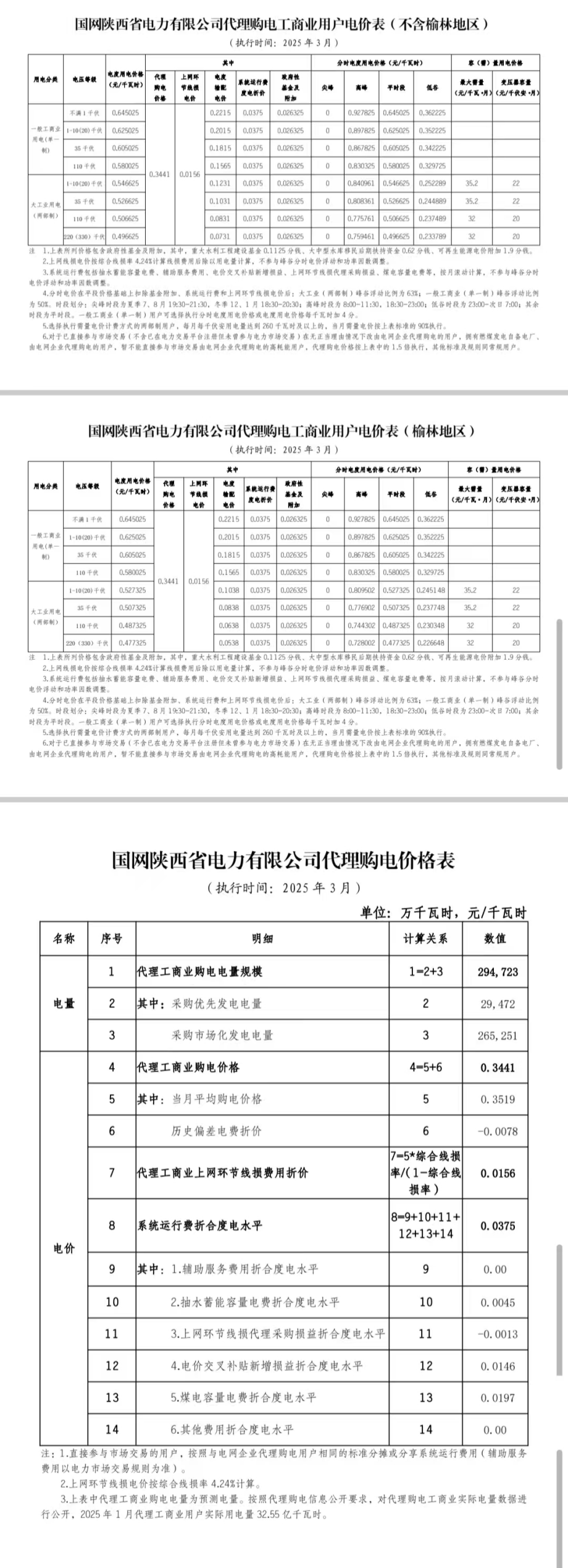 陜西省3月份代理購電工商業(yè)用戶電價表
