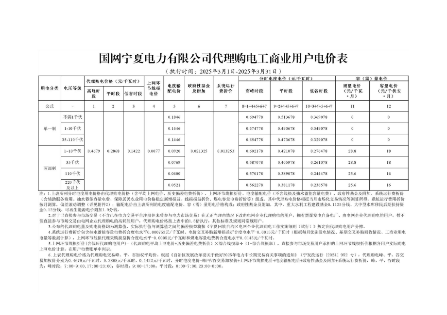 寧夏3月份代理購電工商業(yè)用戶電價表