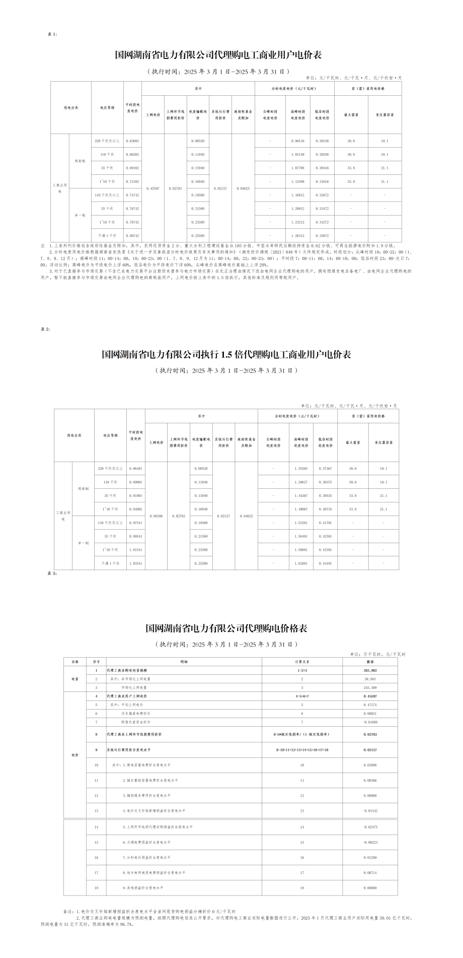 湖南省3月份代理購電工商業(yè)用戶電價表