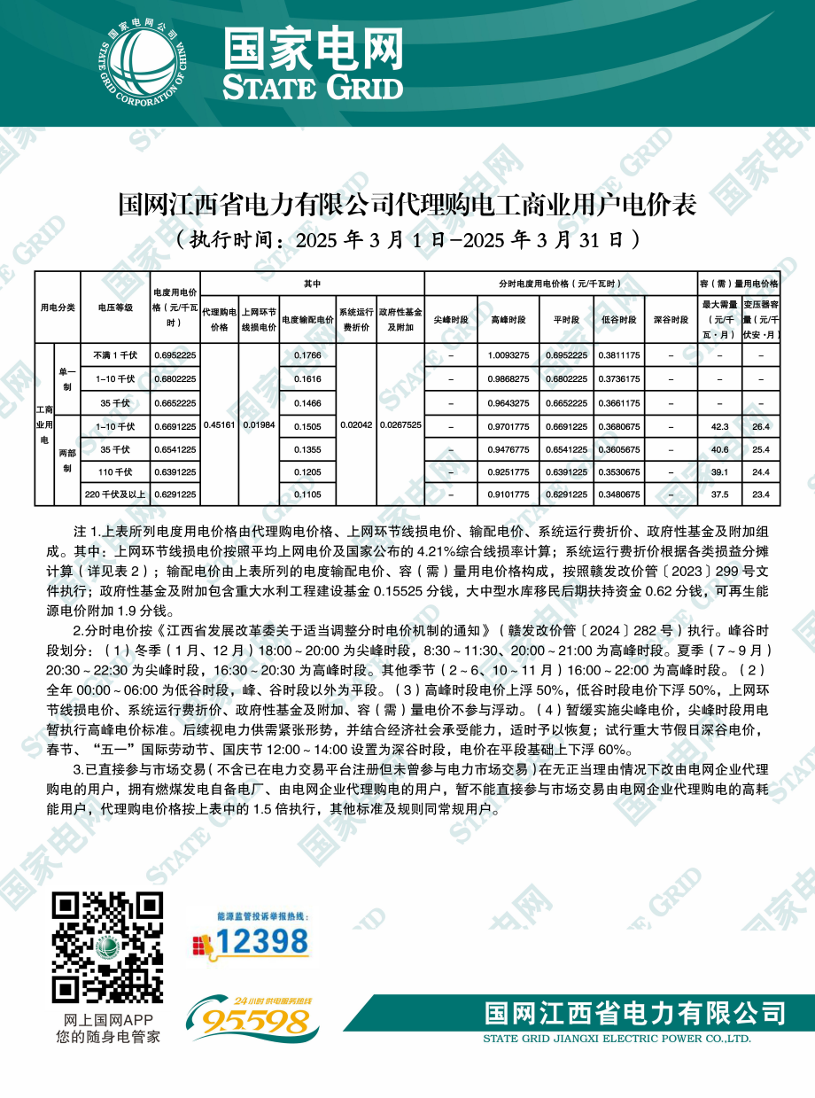 江西省3月份代理購電工商業(yè)用戶電價表