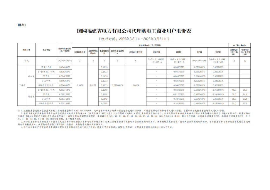 福建省3月份代理購電工商業(yè)用戶電價表