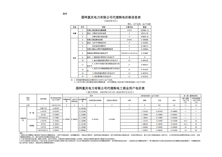 重慶市3月份代理購電工商業(yè)用戶電價表