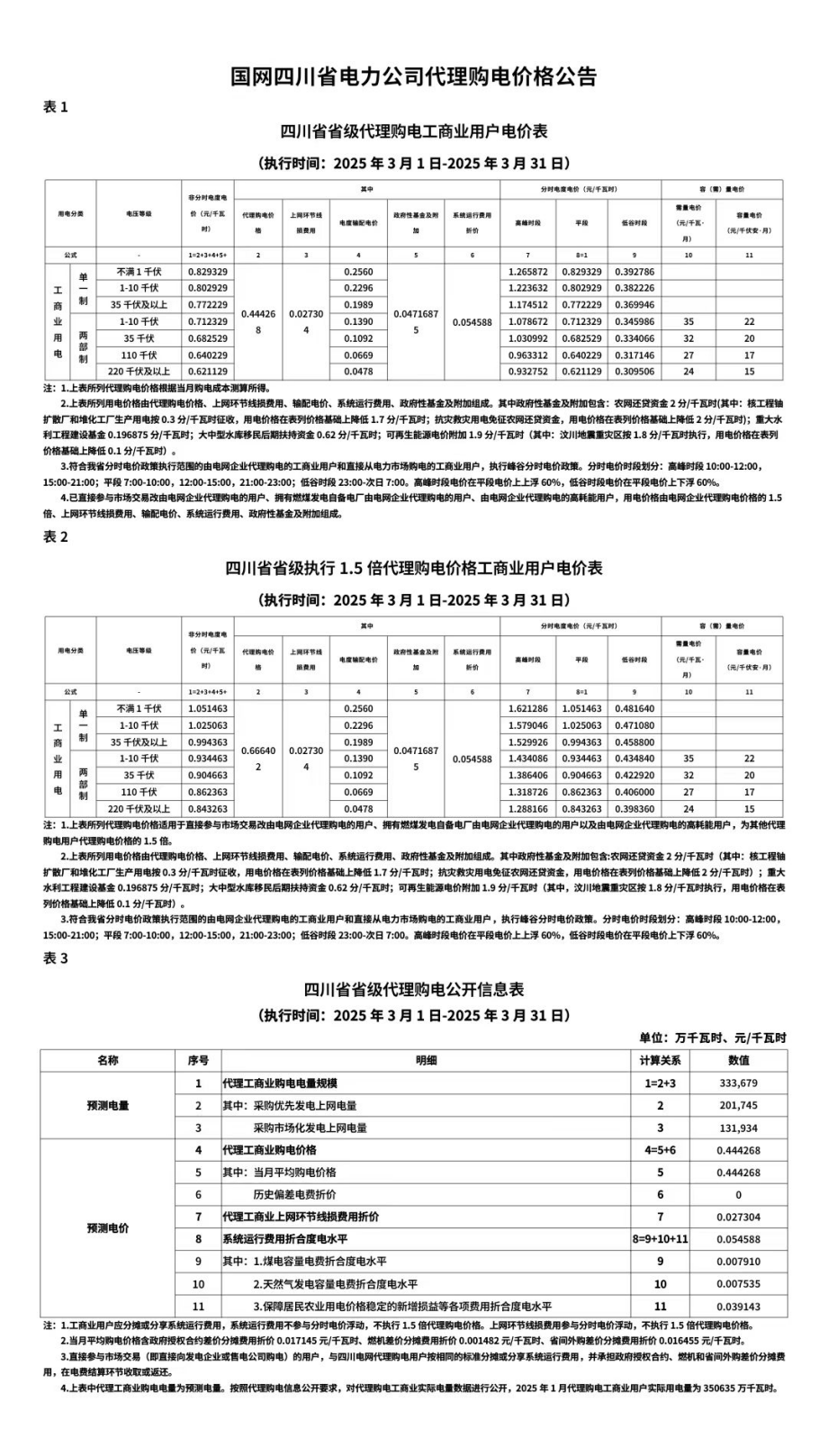 四川省3月份代理購電工商業(yè)用戶電價表