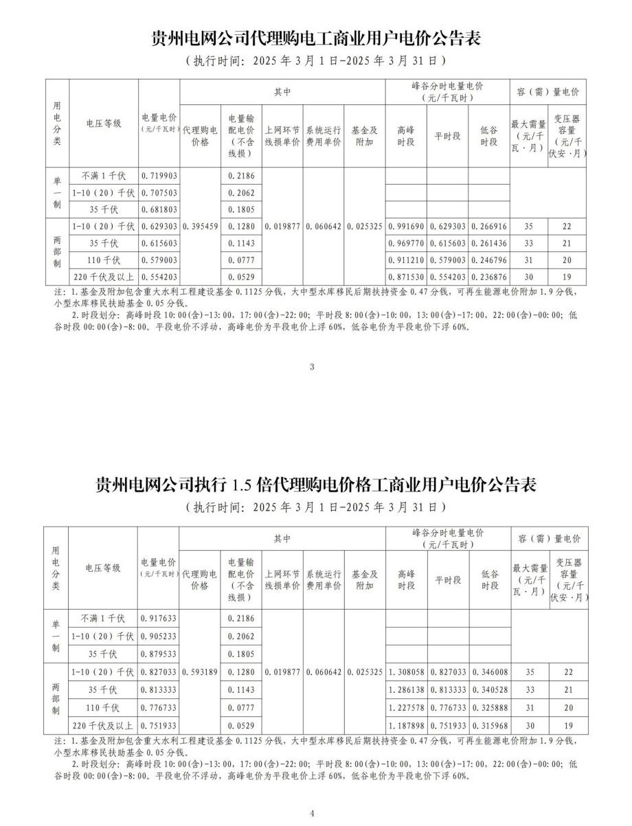 貴州省3月份代理購電工商業(yè)用戶電價表