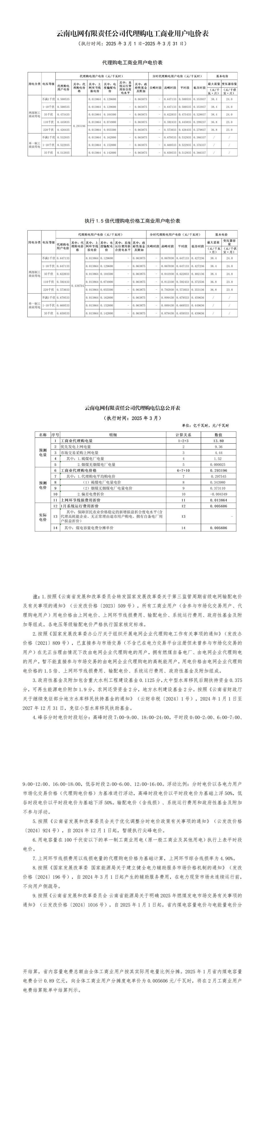 云南省3月份代理購電工商業(yè)用戶電價表