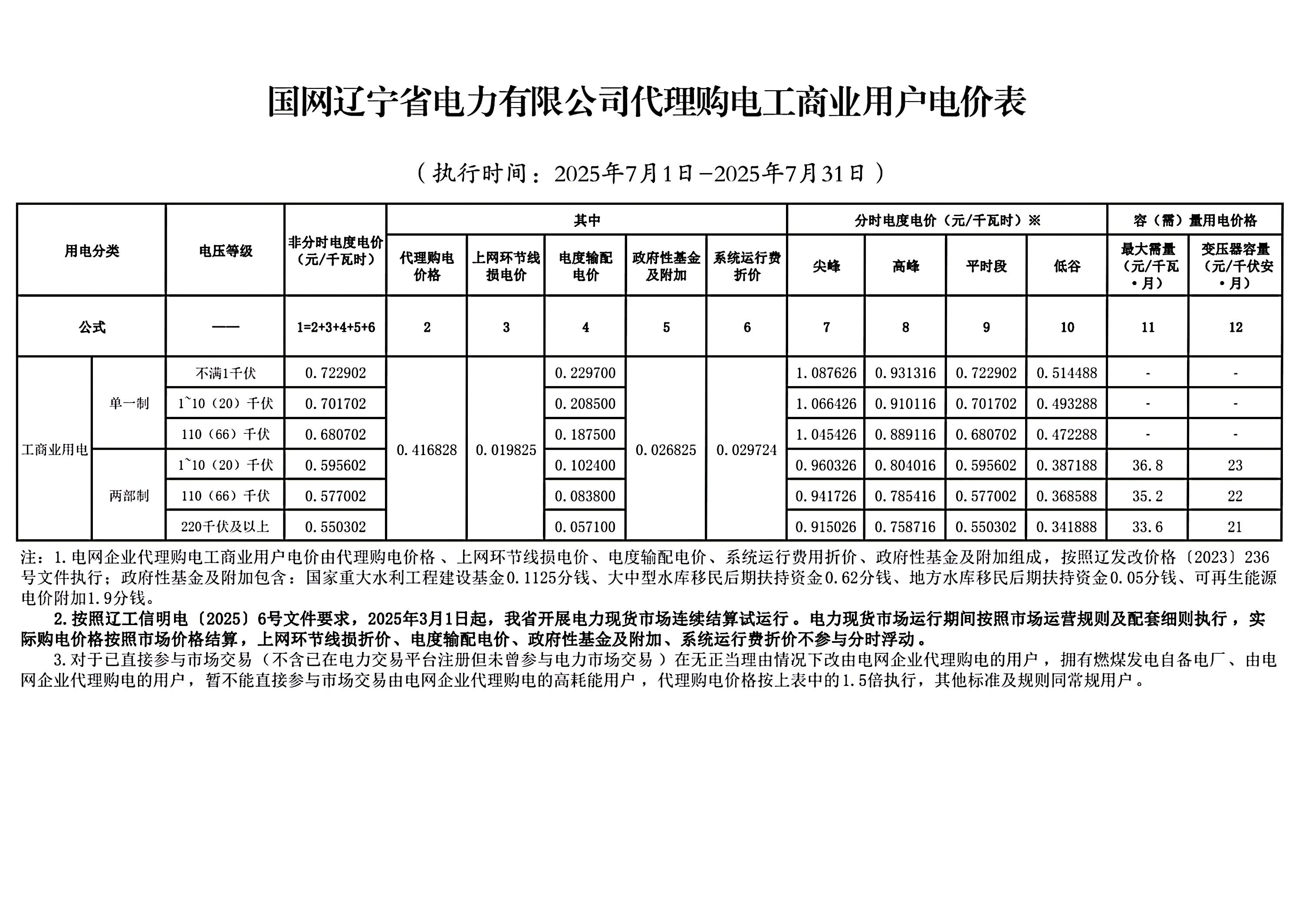 遼寧省7月份代理購電工商業(yè)用戶電價表