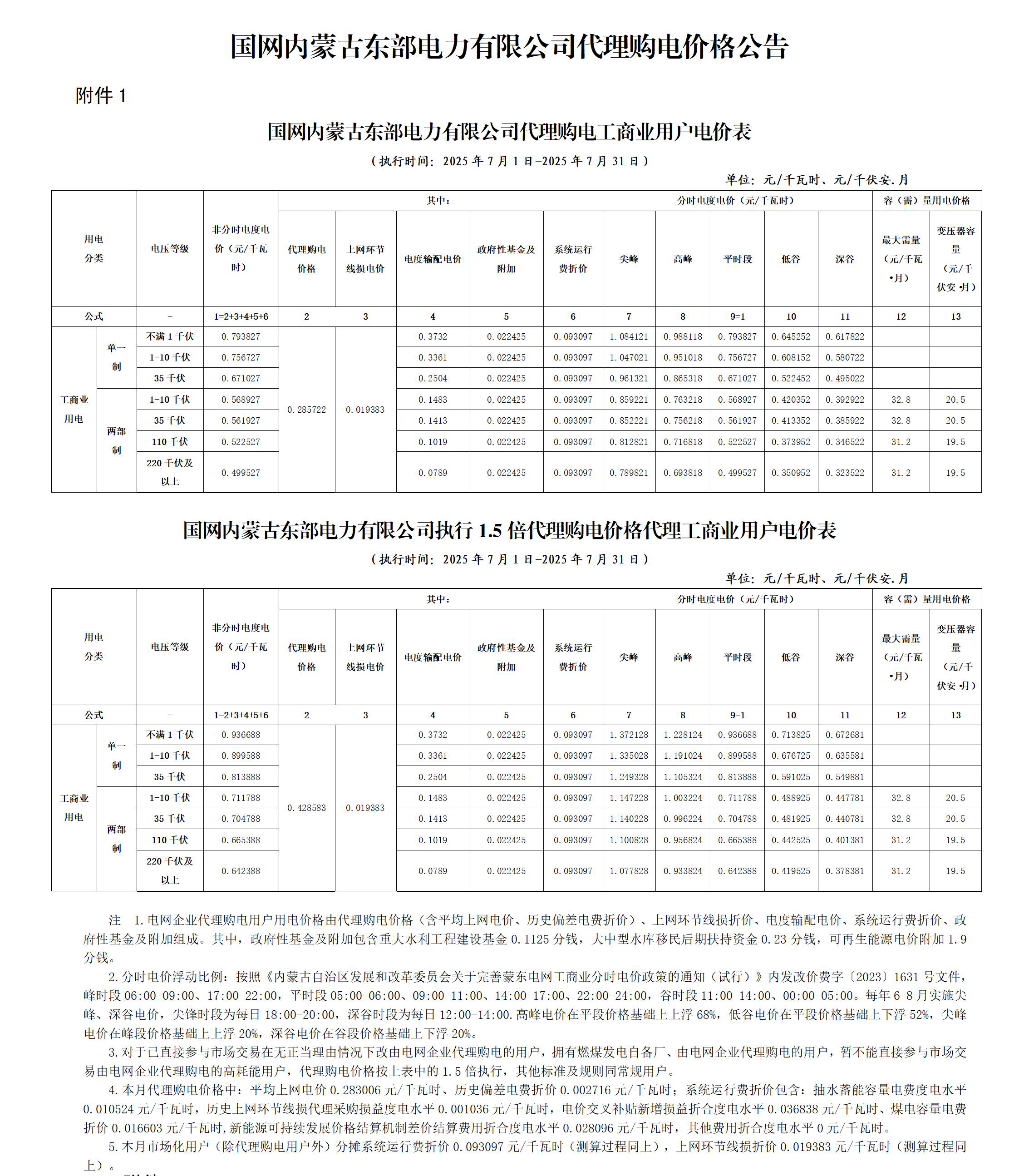 內(nèi)蒙古(蒙東)7月份代理購電工商業(yè)用戶電價表