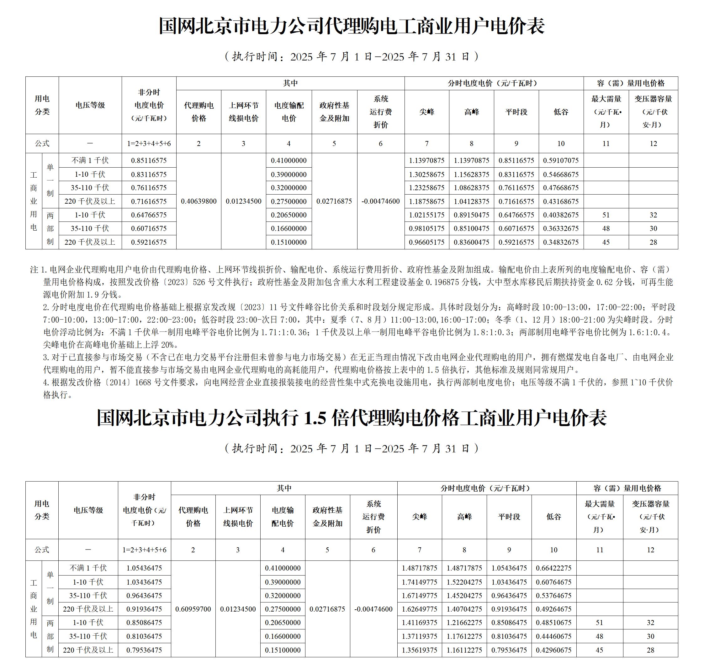 北京市7月份代理購電工商業(yè)用戶電價表