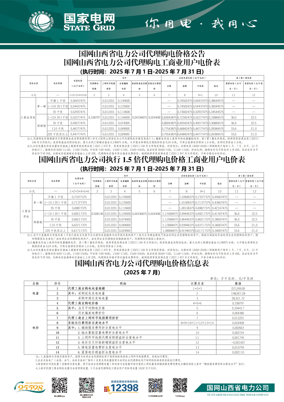 山西省7月份代理購電工商業(yè)用戶電價表