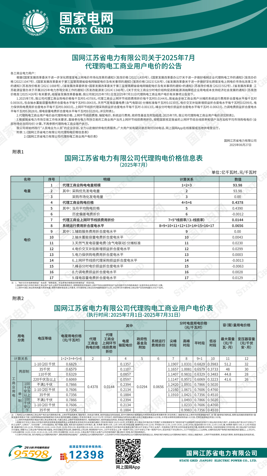 江蘇省7月份代理購電工商業(yè)用戶電價表