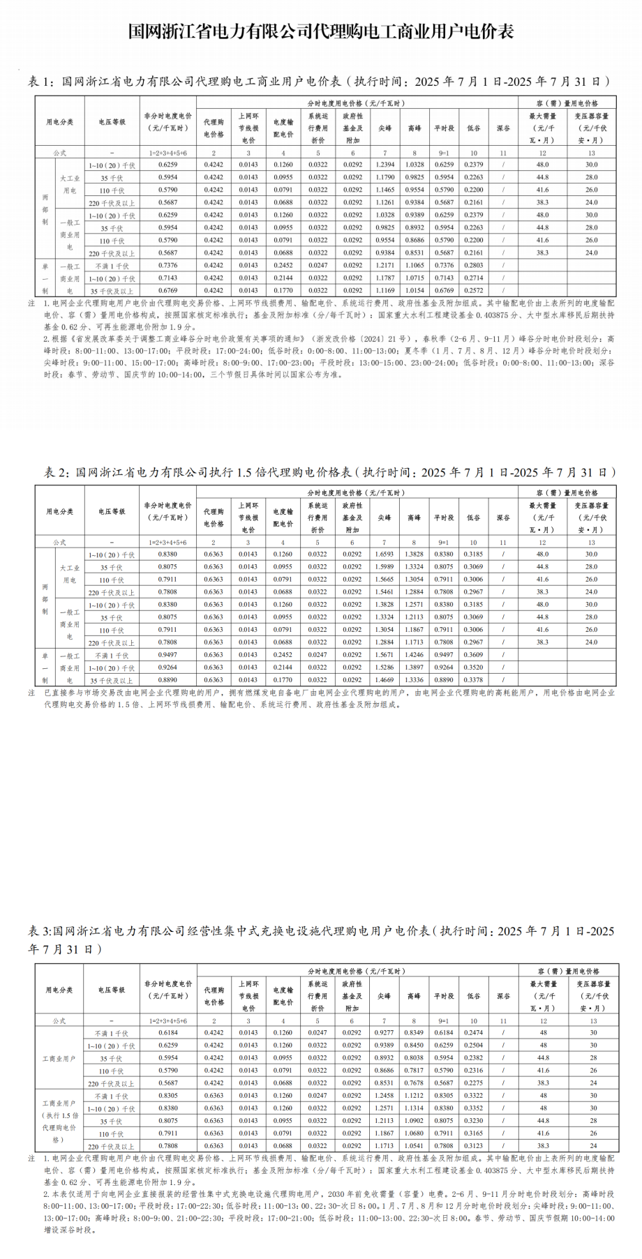 浙江省7月份代理購電工商業(yè)用戶電價表